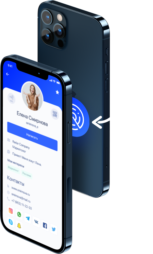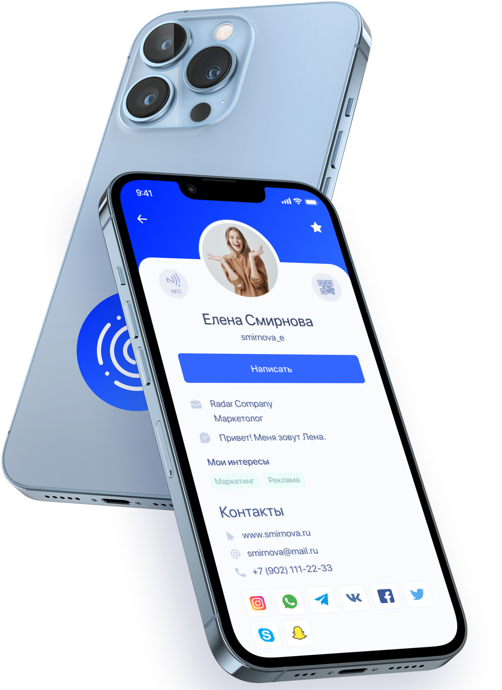 Для активации NFC метки вам нужно скачать приложение Radar, создать в нем свой цифровой профиль и записать ссылку на его на NFC метку.