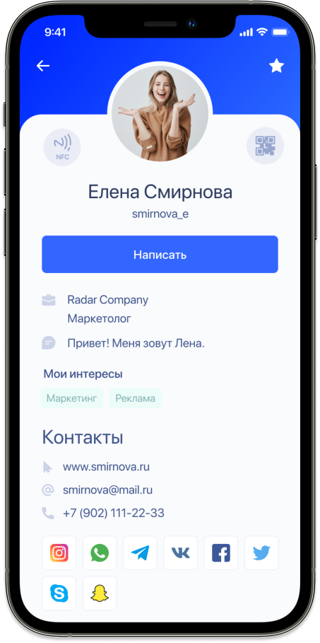 Другому человеку для считывания NFC визитки не требуется установка приложения. Он увидит ваш профиль в браузере и сможет сохранить ваши контакты.